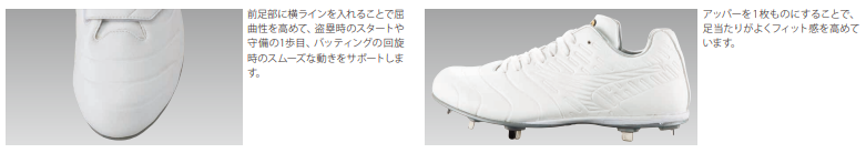 前足部に横向きのラインを入れ込むことで、屈曲性を高めて、盗塁時のスタートや、守備の一歩目、バッティングの回旋時のスムーズな動きをサポートします。